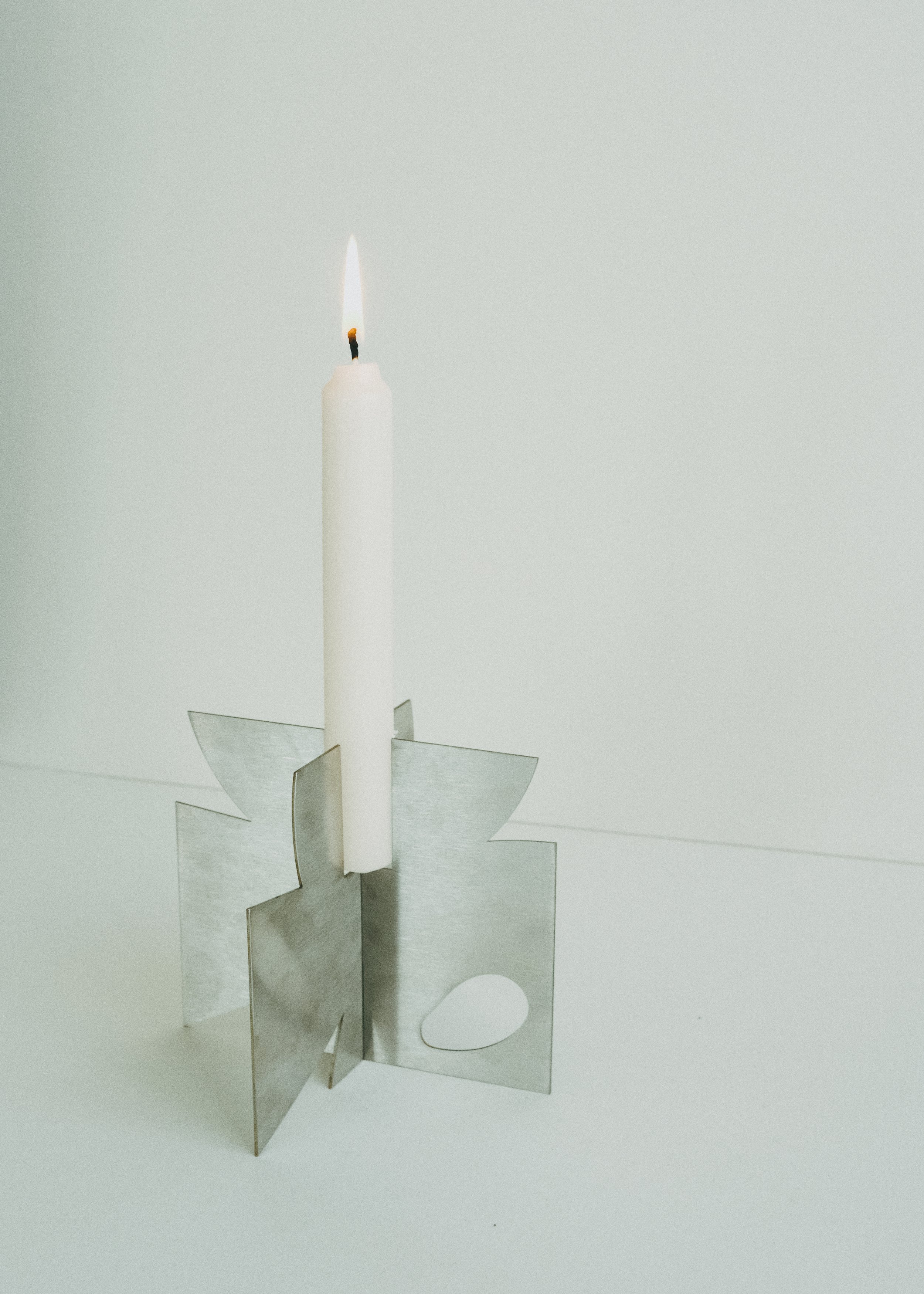 The collection brings together three brushed-steel decorative forms — abstract silhouettes drawn from land, season, and memory — and the Hiwel Candle Holder, formed from two interlocking shapes designed to hold the glow of a single flame. Each object carries a sense of presence and purpose, made to sit naturally in the home as the days lengthen again.